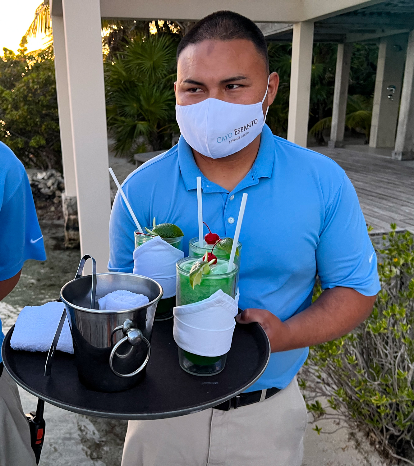 After 10 minutes skipping across the vibrant Caribbean, a receiving line of staff members greeted us with another towel for mopping (it is quite humid) and our first tasty rum drink that exactly matched the color of the sea. Having grown up in the 70s and cutting my teeth on bad tv, I immediately got Fantasy Island vibes from this scene, only instead of Mr. Roark in his white suit you have Rosita with her walkie talkie and the only “Tattoo” in sight was my own.