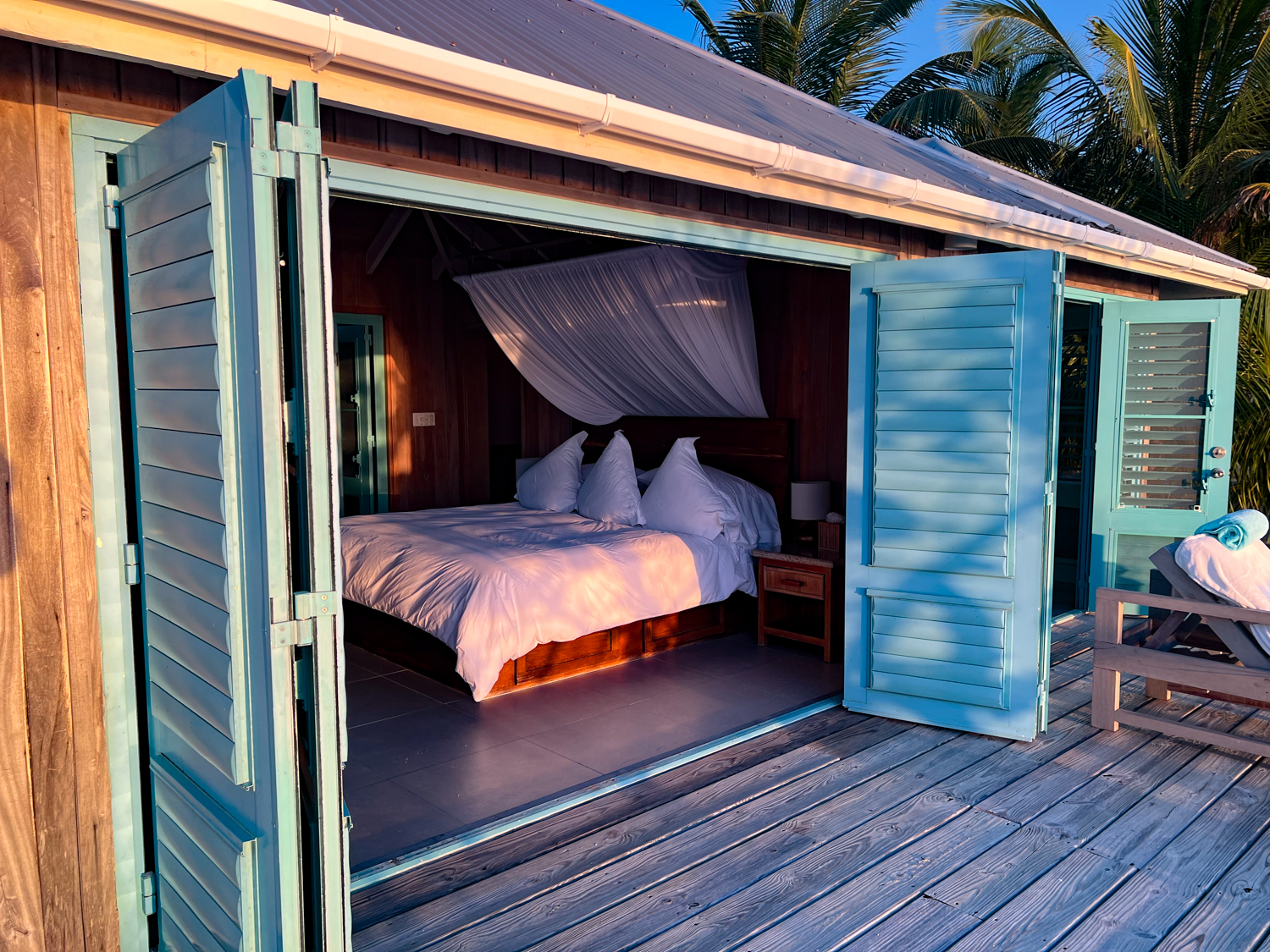 Big, white, fluffy, romantic bed overrun with down pillows of all shapes and sizes crowned with mosquito netting? Check. Multiple outdoor seating areas on wraparound deck to take advantage of unobstructed views of sea and sunsets? Check. Fully stocked mini-fridge, Bluetooth speaker dock and cable tv? Check, check, check. Marine type weird toilet – well, I guess that is part of the price of private island paradise.